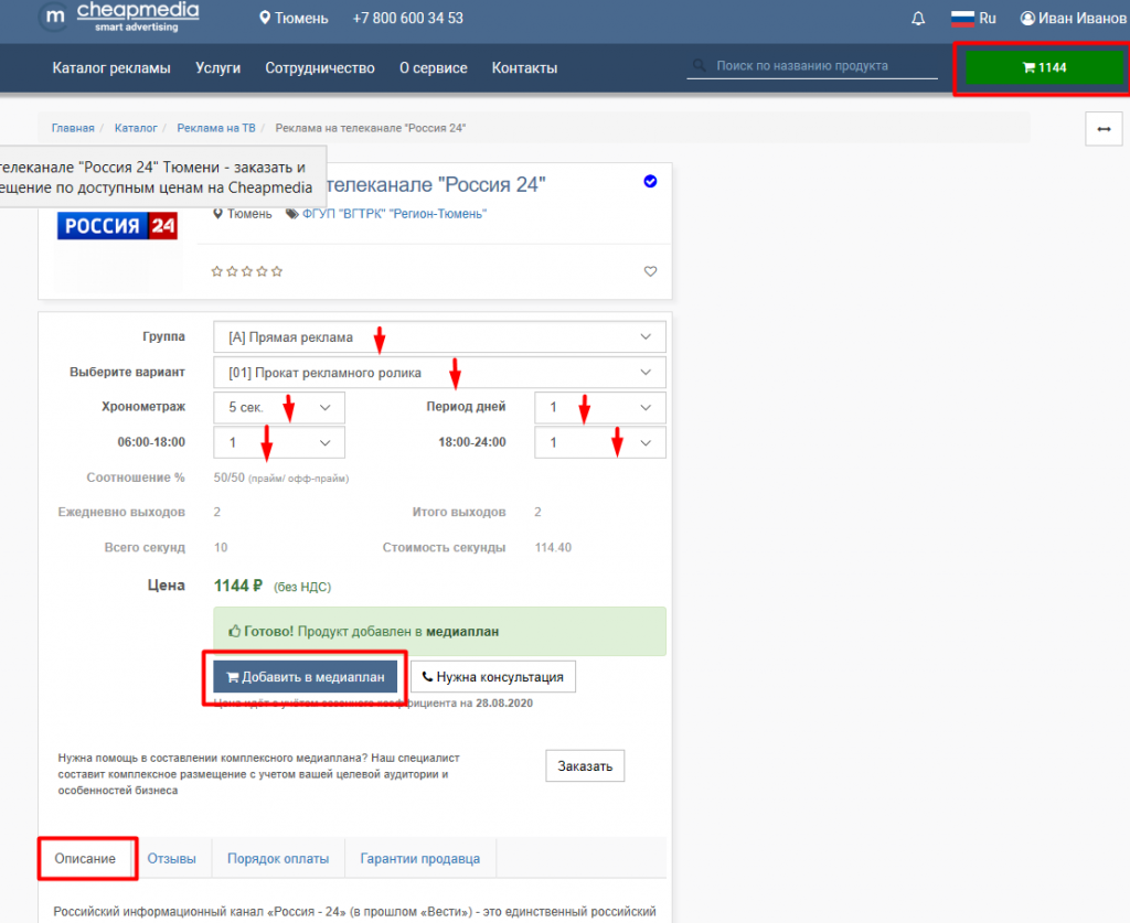Проверьте правильность выбранного периода,количества дней и количества показов. Нажмите кнопку "Добавить в медиаплан".